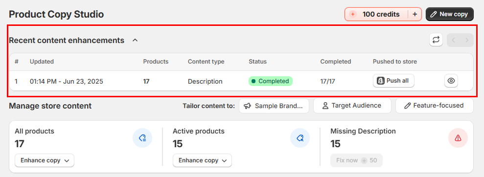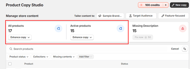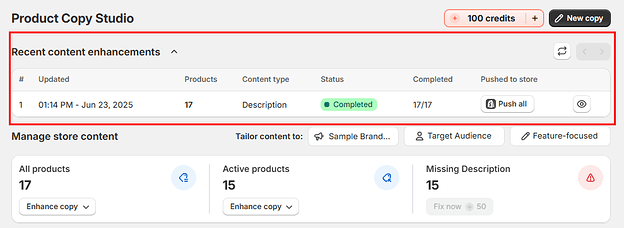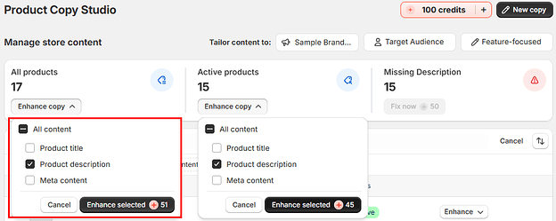 When you want to enhance all of your products at once, go to your homepage and click “Enhance Copy.” You can choose which products to enhance: All products or only Active products.